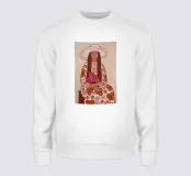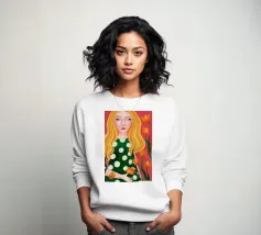 Una giovane donna in abito floreale arancione siede rilassata con un mazzo di fiori in mano. Il cappello bianco e i capelli lunghi conferiscono al dipinto una dolce eleganza. Gli allegri fiori rosa e il motivo floreale sottolineano l'arte naif e la leggerezza del momento.