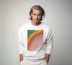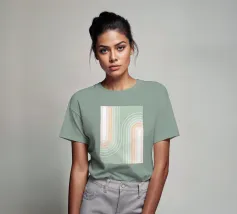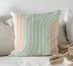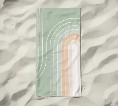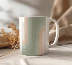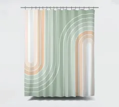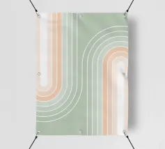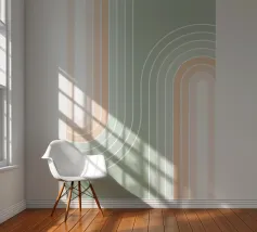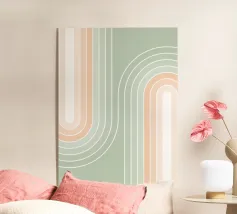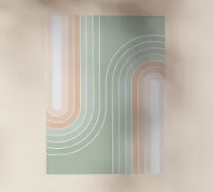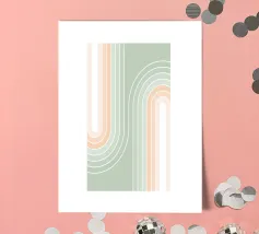 Una rilassante illustrazione grafica astratta a doppio arcobaleno, caratterizzata da linee e forme geometriche bianche in tonalità verde salvia e soffice pesca. Questo disegno sereno e minimale evoca l'inizio della primavera, la tranquillità e l'ottimismo, perfetto per aggiungere un fascino di ispirazione rétro al vostro spazio. Ideale per ravvivare una stanza tranquilla, dona armonia ad opere d'arte da parete, cuscini e accessori, offrendo un'estetica pacifica per una vita moderna.