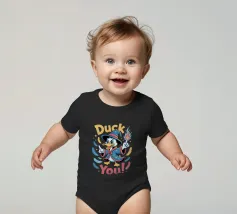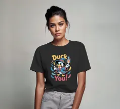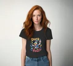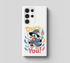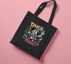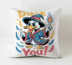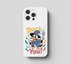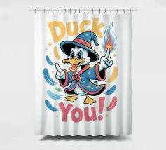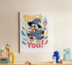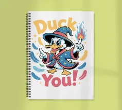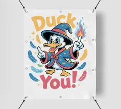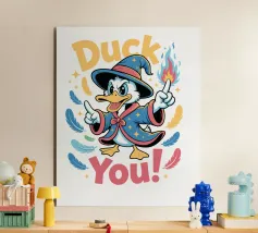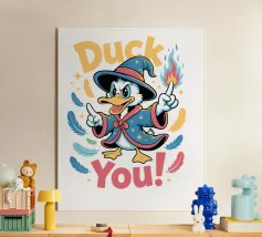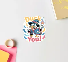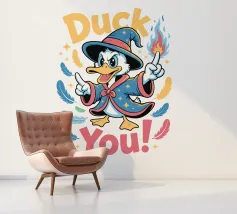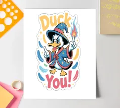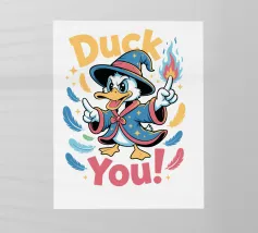 Un papero dei cartoni animati vestito da mago si erge trionfante, circondato da piume colorate e lanciando un incantesimo infuocato con una mano. Il testo "Duck You!" aggiunge un tono umoristico e giocoso alla composizione.