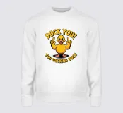 Al centro si trova un'anatra dei cartoni animati, che sfoggia un'espressione di sfida divertente e alza le ali in un gesto non convenzionale. Il testo giallo in grassetto sopra e sotto l'anatra recita un messaggio umoristico.