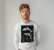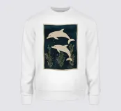 Due delfini che nuotano in acque blu profonde con morbide piante marine intorno a loro. I toni delicati e il movimento calmo creano una scena pacifica.