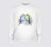 Disegno ad acquerello di due simpatici pappagallini seduti l'uno accanto all'altro. L'uccello di sinistra ha il ventre blu e la fronte bianca ed è un maschio. L'uccello a destra ha il ventre verde/turchese e la fronte gialla ed è una femmina. Una coppia molto carina.