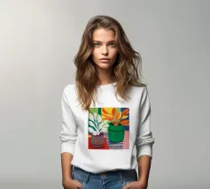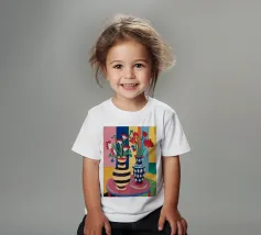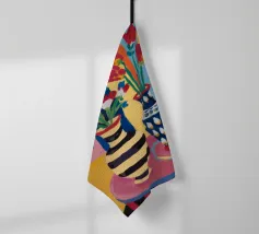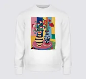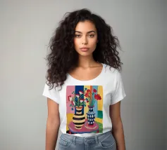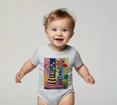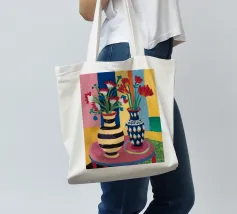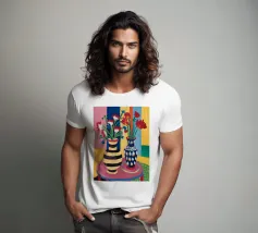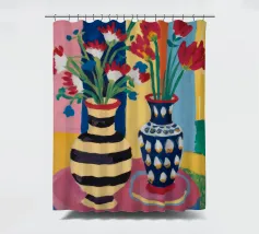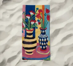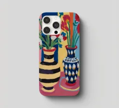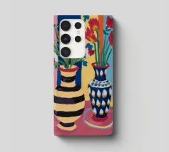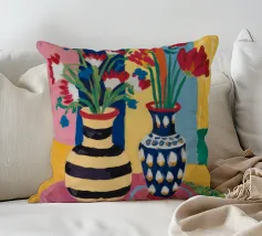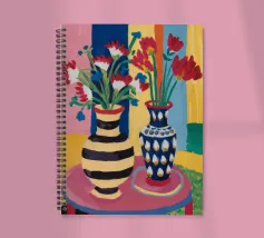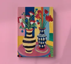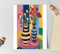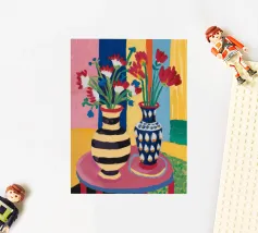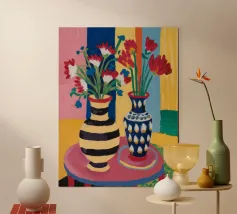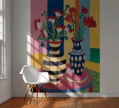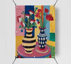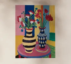 Una vivace natura morta con due vasi, uno a strisce bianche e nere e l'altro con un motivo giallo, entrambi con fiori rossi. La composizione è collocata su uno sfondo rosa e verde, creando una dinamica giocosa e colorata.