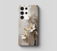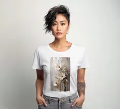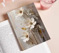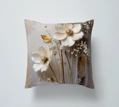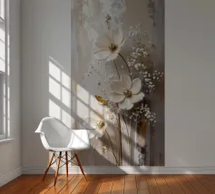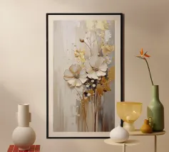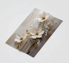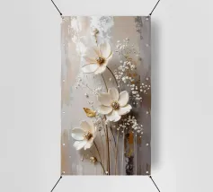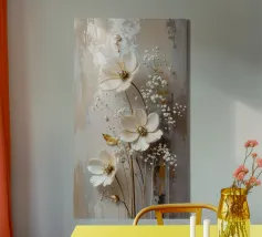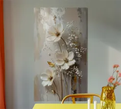 Questo moderno design floreale in 3D combina un'eleganza senza tempo con fiori delicati nei toni del bianco crema e del beige che emergono vivacemente dallo sfondo e creano un affascinante effetto di profondità. Ogni forma del fiore è ricca di dettagli, dai petali curvi alle strutture di perle finemente accentuate al centro. Lo sfondo strutturato in toni morbidi di grigio e naturale forma un contrasto armonioso con gli elementi floreali. Gli accenti dorati conferiscono all'opera un tocco lussuoso e rendono il quadro particolarmente elegante in diverse condizioni di luce.