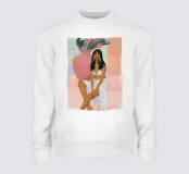 Questa opera d'arte raffigura una persona in abito bianco seduta davanti a un grande vaso rosa con fiori. Lo sfondo è minimalista e sottolinea l'eleganza e la semplicità della scena.