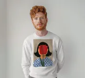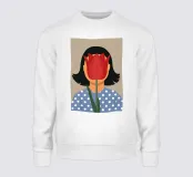 Un ritratto surreale e intrigante in cui il volto di una donna è oscurato da un grande tulipano rosso. Il suo top a pois e lo sfondo semplice creano un'immagine misteriosa e artistica che gioca con l'identità e la natura.