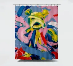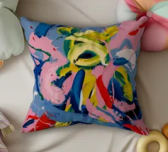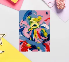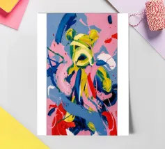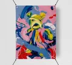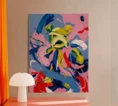 Questo dipinto presenta un'esplosione caotica di colori e forme. I colori dominanti sono il rosa, il blu e il giallo, che creano un senso di movimento ed energia.
