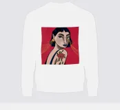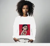 Questo dipinto raffigura una persona con un tatuaggio di una rosa sulla spalla. La persona indossa grandi orecchini d'oro e lo sfondo è di un rosso intenso, che sottolinea la natura audace ed espressiva dell'opera.