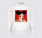Questo dipinto raffigura una persona con i capelli scuri acconciati in due chignon, che indossa grandi orecchini arancioni. Il volto della persona è dipinto con audaci motivi rossi e bianchi, mentre lo sfondo è di colore rosso pieno.