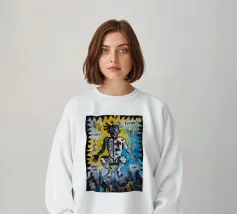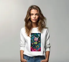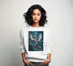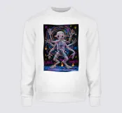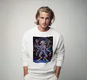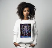 Una figura scheletrica con arti allungati irradia energia cosmica mentre forme vorticose la circondano. Luminosi motivi al neon arricchiscono la composizione surreale e fluida.