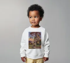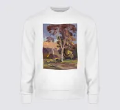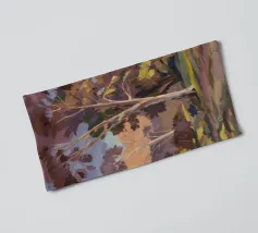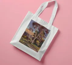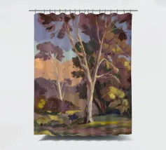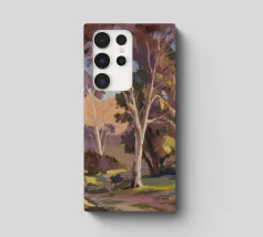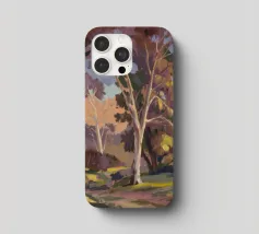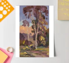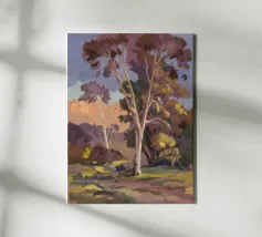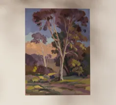 Paesaggio dipinto con alti alberi di eucalipto o simili, con tronchi marrone rossastro e rade chiome verdi e gialle. Lo sfondo è una vaga miscela di blu e viola.