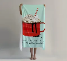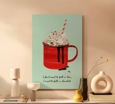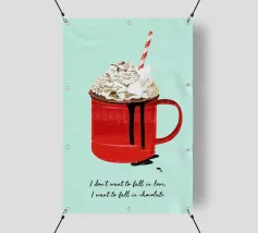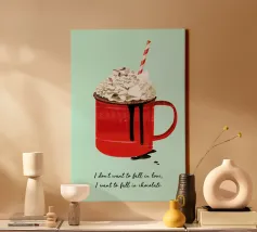 Un'illustrazione spiritosa, deliziosa e golosa di una tazza piena di cioccolata calda e panna montata. Il testo dice: "Non voglio innamorarmi, voglio innamorarmi della cioccolata".
