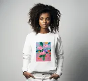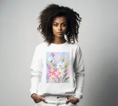 Il motivo mostra una composizione floreale dinamica e astratta, dai colori pastello decisi ma delicati. Pennellate di rosa, arancio e verde formano una moderna interpretazione di un bouquet estivo. La pittura conferisce all'opera profondità, leggerezza e un'aura naturale e vivace.