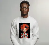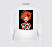 Un dipinto che ritrae una persona con capelli rosso vivo e farfalle intorno alla testa, che indossa un abito a motivi floreali.