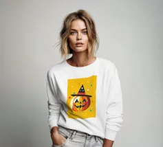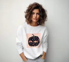 Accoglienti vibrazioni autunnali e di Halloween con questo motivo di Halloween ispirato al cottage core. Una zucca allegra e sgraziata disegnata in uno stile da cartone animato adatto ai bambini.