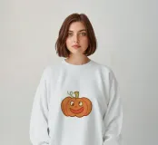 Accoglienti vibrazioni autunnali e di Halloween con questo motivo di Halloween ispirato al cottage core. Una zucca allegra e sgraziata disegnata in uno stile da cartone animato adatto ai bambini.