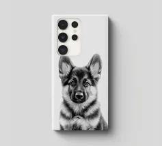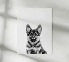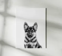 Questo simpatico ritratto illustrato in bianco e nero di un piccolo pastore tedesco cattura la dolce innocenza dei cuccioli e irradia puro amore canino. Con la sua morbida pelliccia e il muso giocoso, è il motivo perfetto per gli amanti degli animali!