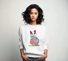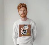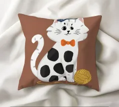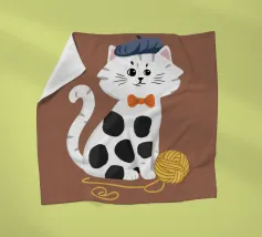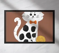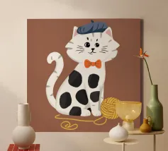 Un'affascinante illustrazione di un gatto bianco con macchie nere, che indossa un papillon rosso e una benda per gli occhi e interagisce giocosamente con un gomitolo di filo giallo. Lo sfondo è di un marrone tenue, che mette in risalto la personalità eccentrica e adorabile del gatto.