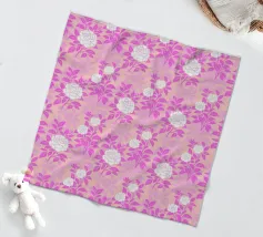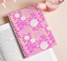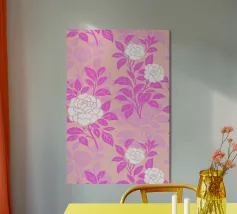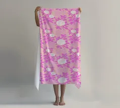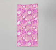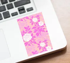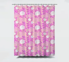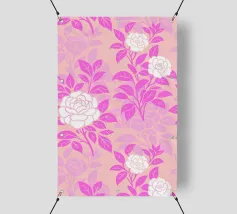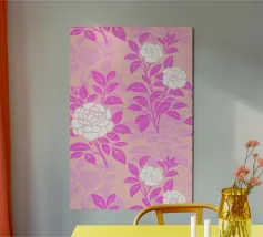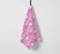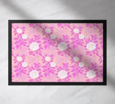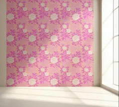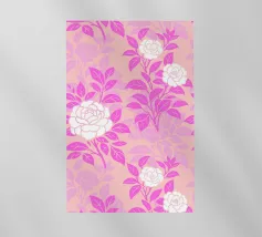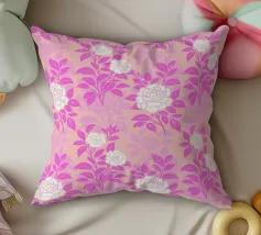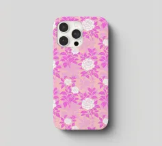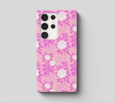 Splendida stampa floreale con fiori di camelia bianchi e foglie rosa caldo, su uno sfondo color pesca.