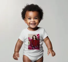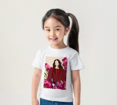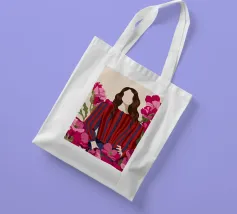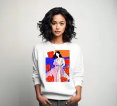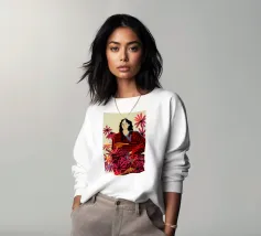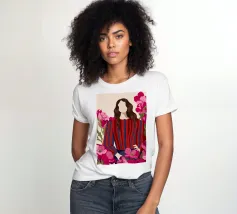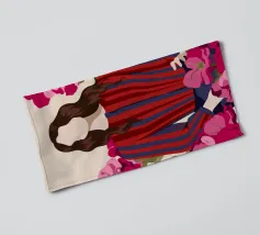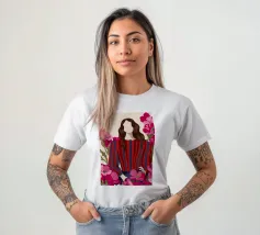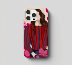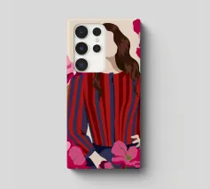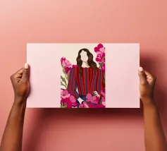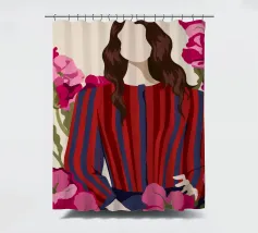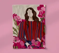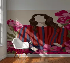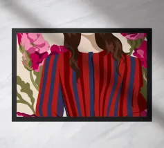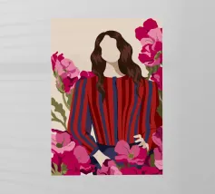 Un dipinto di una persona con un vestito a righe rosse e blu, circondata da fiori rosa.