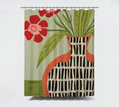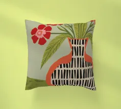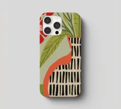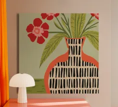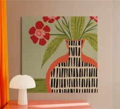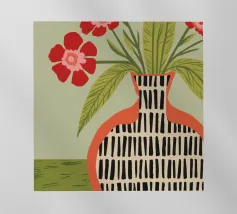 Semplici fiori rossi sono disposti in un vaso alto e stravagante con un motivo a strisce disegnato a mano, creando una natura morta affascinante e stravagante con un tocco di arte popolare.