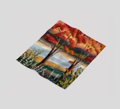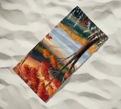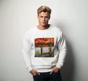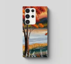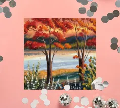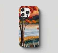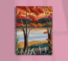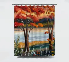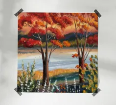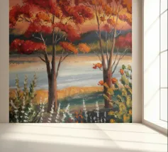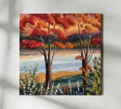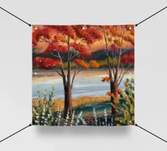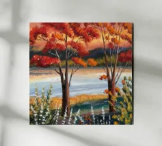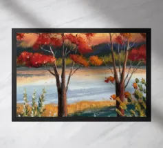 Alberi rosso fuoco risplendono lungo un fiume calmo, sotto un cielo morbido, esprimendo la trasformazione stagionale.