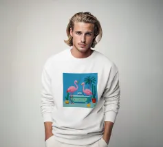 A nostalgic Palm Springs scene: a pink flamingo swim ring drifting in a turquoise pool, framed by soft pastel loungers and towering palms. This artwork brings retro summer spirit, relaxed vacation mood, and mid-century charm to any wall — ideal for living rooms, bedrooms, or stylish poolside decor.