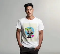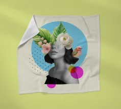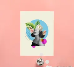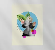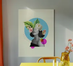 Questo sognante poster a collage presenta un ritratto femminile in scala di grigi che si fonde perfettamente con vivaci elementi tropicali. Grandi foglie verdi e delicati fiori bianchi e rosa sbocciano dalla sua testa, accompagnati da un piccolo uccello colorato, evocando un senso di serena immaginazione e natura interiore. In un morbido cerchio blu e con accenti grafici punteggiati, quest'opera d'arte combina surrealismo, bellezza botanica e minimalismo moderno: ideale per l'arredamento bohémien, gli spazi femminili o le collezioni d'arte contemporanea.