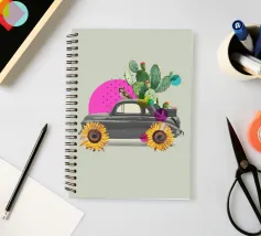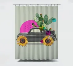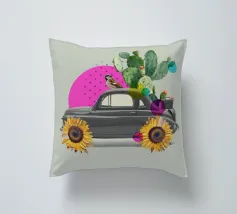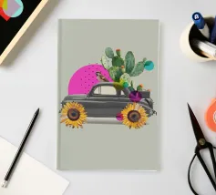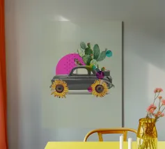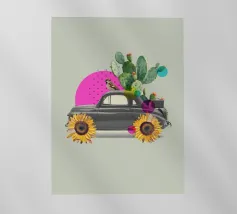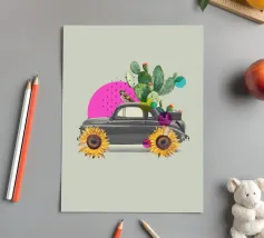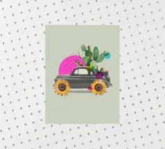 L'eccentricità incontra la botanica in questa stravagante stampa d'arte a collage con un'auto d'epoca trasformata in una fioriera nel deserto, completa di cactus in fiore, girasoli per le ruote e un passero appollaiato. Le vivaci forme astratte in rosa caldo e verde acqua aggiungono un tocco giocoso allo sfondo tenue, rendendo questo pezzo un accento divertente e moderno per interni eclettici, spazi boho o amanti dell'arte surreale.