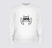 Un gatto dei cartoni animati che indossa occhiali da sole mostra con umorismo un atteggiamento sfrontato con le zampe centrali sollevate. Il testo in grassetto sopra e sotto il gatto aggiunge un messaggio giocoso allo sfondo grigio.