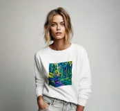 An expressive, painterly landscape of a path alongside a stream flowing through a forest. The vibrant blues, greens, and yellows create a dynamic, beautiful, and slightly abstract depiction of a walk in nature.