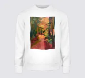 Quadro astratto della foresta con la calda luce del sole che filtra attraverso gli alberi, dipinto con audaci pennellate di verde, rosso e oro.