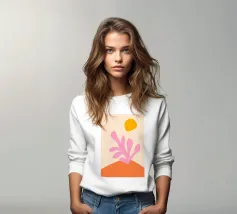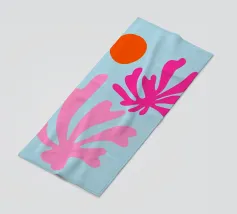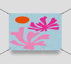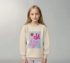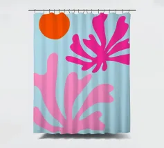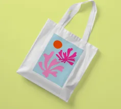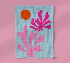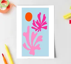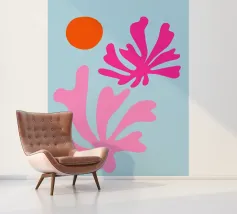 arte botanica astratta, forme moderne di piante, foglie di corallo rosa, illustrazione del sole arancione, sfondo blu pastello, design floreale minimalista, natura astratta contemporanea, grafica fogliare giocosa, opera d'arte dalle forme audaci, stampa ispirata a Matisse, atmosfera moderna tropicale, flora astratta vibrante