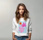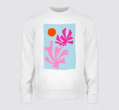 arte botanica astratta, forme moderne di piante, foglie di corallo rosa, illustrazione del sole arancione, sfondo blu pastello, design floreale minimalista, natura astratta contemporanea, grafica fogliare giocosa, opera d'arte dalle forme audaci, stampa ispirata a Matisse, atmosfera moderna tropicale, flora astratta vibrante