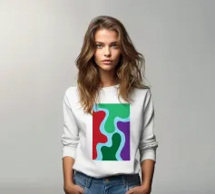 Un'opera d'arte astratta caratterizzata da forme audaci e fluide in una calda tavolozza di rosso, arancione e giallo, contrastata da un profondo verde acqua. Le forme ricordano la lava fusa o il liquido, creando una visione potente e dinamica.