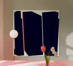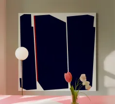 Opera d'arte astratta minimalista con tre grandi blocchi geometrici scuri dai bordi netti su sfondo bianco. Una singola linea verticale rossa aggiunge contrasto e struttura. Audace, pulita e architettonica, questa composizione conferisce un'atmosfera moderna e grafica a qualsiasi spazio.
