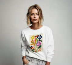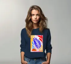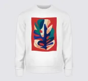 L'opera d'arte astratta presenta forme audaci e ritagliate di foglie e forme organiche nei colori blu, rosso e verde, chiaramente ispirate all'opera iconica di Henri Maraoui.