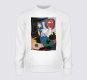 Questo dipinto mostra una composizione astratta con un mix di forme geometriche e organiche. I colori sono decisi e comprendono il nero, il blu, il rosso e il bianco. Le forme si sovrappongono e creano un senso di profondità.
