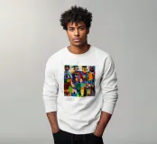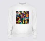Questo dipinto raffigura un gruppo di forme umane astratte in un ambiente colorato e dinamico. Le figure hanno tratti esagerati e sono circondate da motivi e forme vibranti, creando una composizione vivace ed energica.