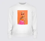 Questa elegante illustrazione di ritratto di una giovane donna incarna il look estivo con il suo top con le spalline e i fiori colorati in morbide tonalità pastello. Con occhiali da sole, orecchini e collana, la giovane irradia freschezza, mentre l'acconciatura bionda e il cerchietto completano il suo look. Circondata da un gioco di colori arancioni, rosa e beige, porta alla ribalta il sole, la spiaggia e il mare.