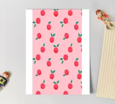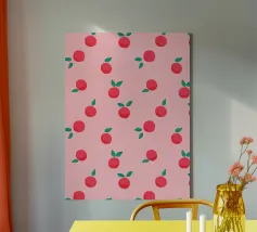Morbide pesche maturate al sole con accenti verdi e frondosi spiccano su uno sfondo rosa rosato in questo affascinante disegno dipinto a mano. Evocando calde brezze e giornate di frutteto, questo disegno fruttato è perfetto per aggiungere un tocco dolce ed estivo a qualsiasi spazio. Ideale per cucine, camere da letto o interni giocosi, questa opera d'arte è una delizia succosa per gli amanti della frutta e per gli appassionati di arredamento moderno.