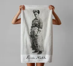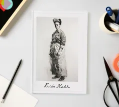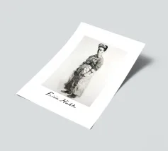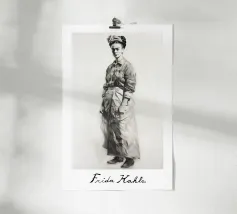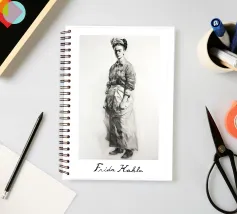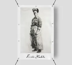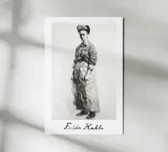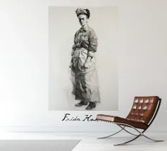 Disegno grafico a mano di Frida Kahlo: questo dettagliato disegno digitale mostra Frida Kahlo in una potente postura eretta che irradia forza e determinazione. Le ombreggiature e i tratti sottili conferiscono all'immagine profondità e dimensione. La firma di Frida è integrata con stile.