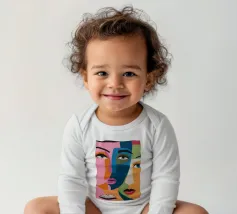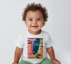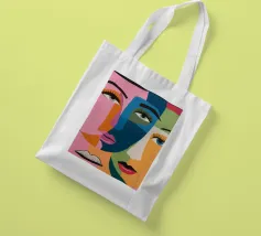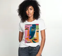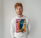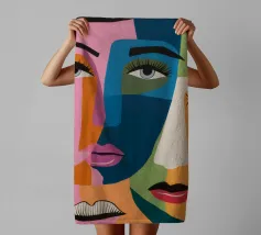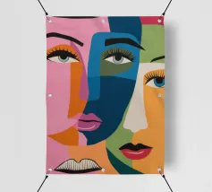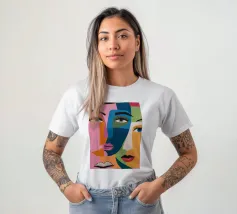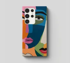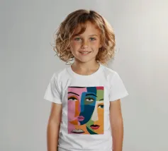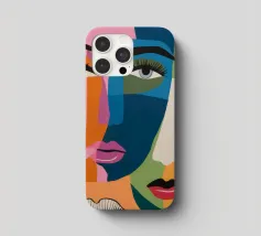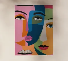 Un audace ritratto astratto di un volto in stile cubista, che utilizza forme geometriche e una sorprendente tavolozza di colori blu, verde, rosa e arancione per decostruire e riassemblare i tratti.