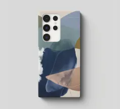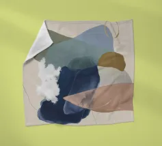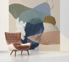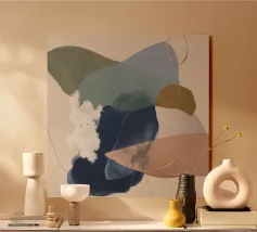 Un dipinto astratto con forme organiche morbide e sovrapposte in toni tenui di verde oliva, blu polveroso e beige, con un accento scuro di fondo, che crea un'atmosfera calma e terrena.