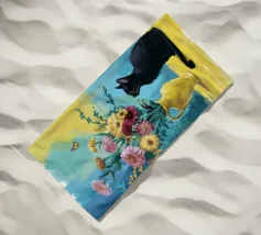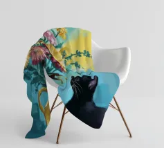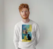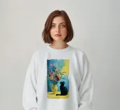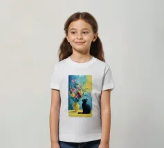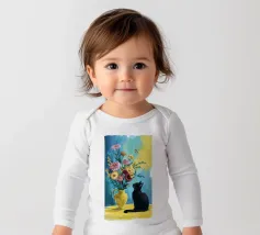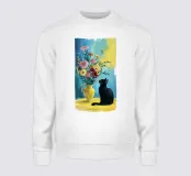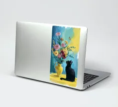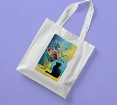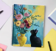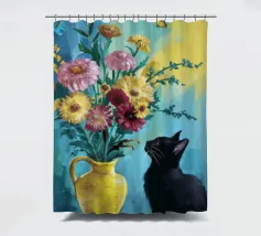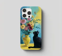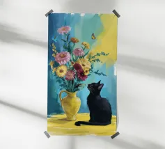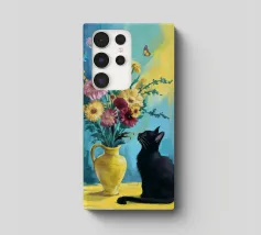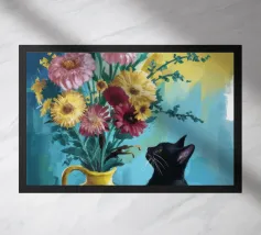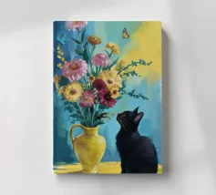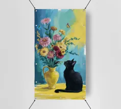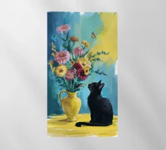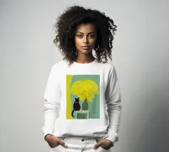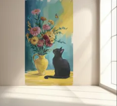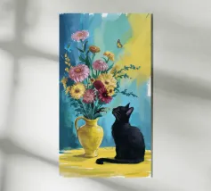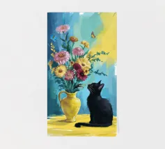 La silhouette di un gatto nero seduto accanto a un vaso di fiori gialli, che li guarda dall'alto. La composizione è uno studio semplice, elegante e toccante della curiosità e della bellezza.
