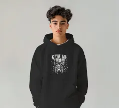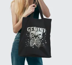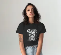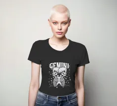 Due scheletri umani sono affiancati sotto la scritta in grassetto "GEMINI", circondata da stelle scintillanti.