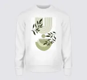 Linee curve e forme circolari formano un disegno astratto, completato da rami frondosi in varie tonalità di verde. La composizione crea un equilibrio armonioso tra elementi geometrici e naturali.