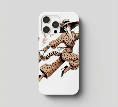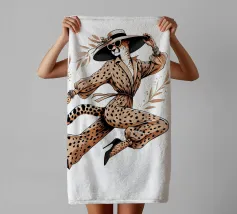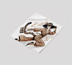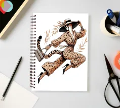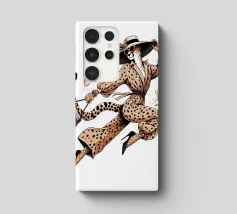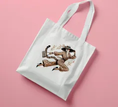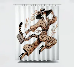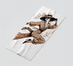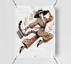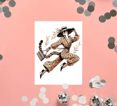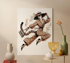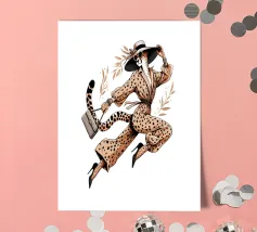 Illustrazione di moda di un ghepardo con cappello e tacchi alti che trasporta una borsa.