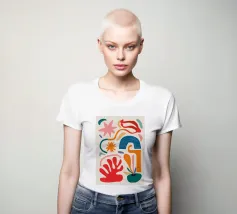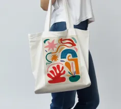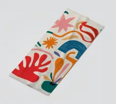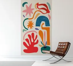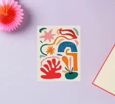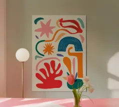 Questa composizione astratta è una danza giocosa di forme organiche e geometriche, chiaramente ispirata ai ritagli di Maraoui. La disposizione ritmica delle forme in una tavolozza di arancione, blu, rosa e beige crea un senso di movimento gioioso e armonioso.