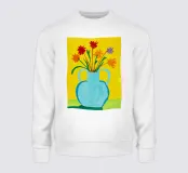 Un allegro ed espressivo bouquet di fiori gialli in un vaso blu brillante con due grandi manici. Lo sfondo giallo solare esalta la sensazione di gioia pura, semplice e senza fronzoli.